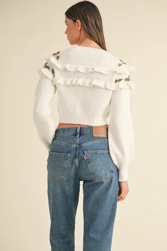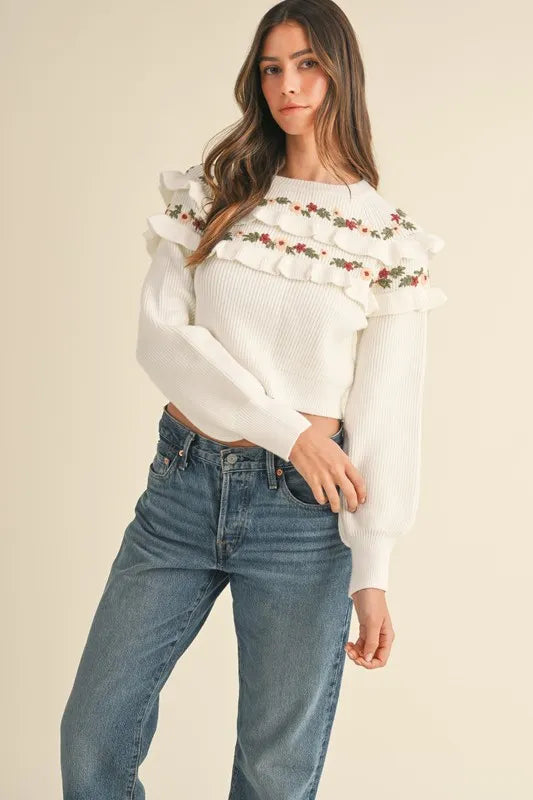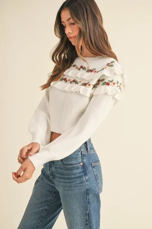 MABLE Floral Embroidered Ruffle Detail Sweater