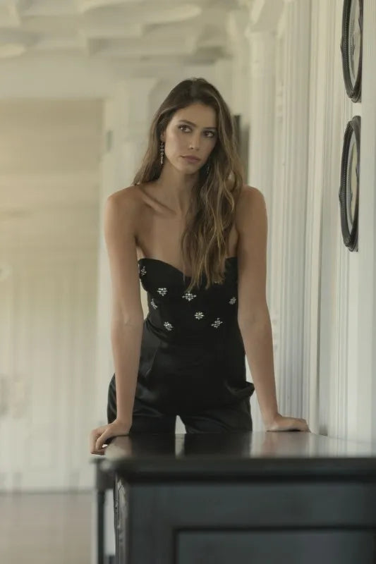 MABLE Rhinestone Applique Bustier Jumpsuit - Black / S está agotado y se enviará tan pronto como vuelva a estar disponible.