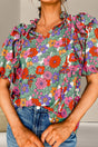 Ruffled Printed Tie Neck Short Sleeve Blouse - Floral / S está agotado y se enviará tan pronto como vuelva a estar disponible.
