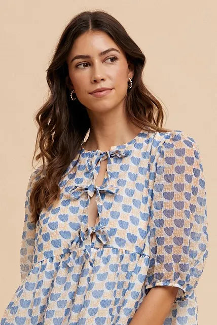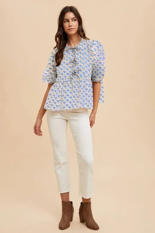 Annie Wear Printed Front Tie Closure Babydoll Blouse