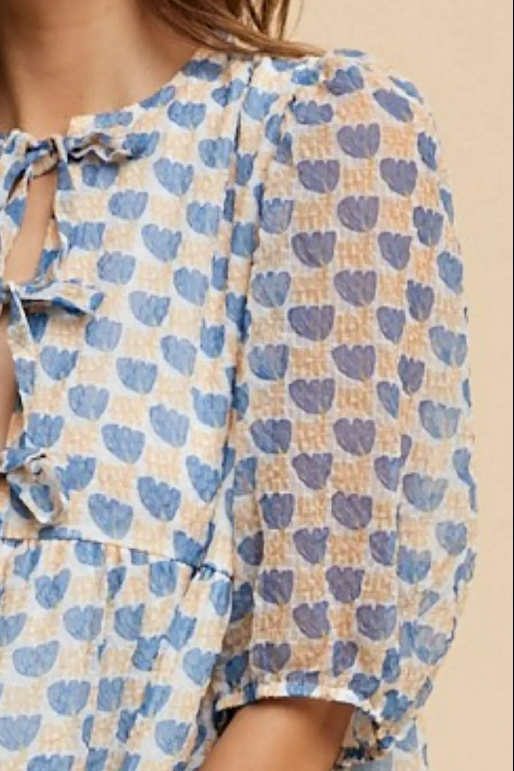 Annie Wear Printed Front Tie Closure Babydoll Blouse - ROYAL / S is backordered and will ship as soon as it is back in stock.