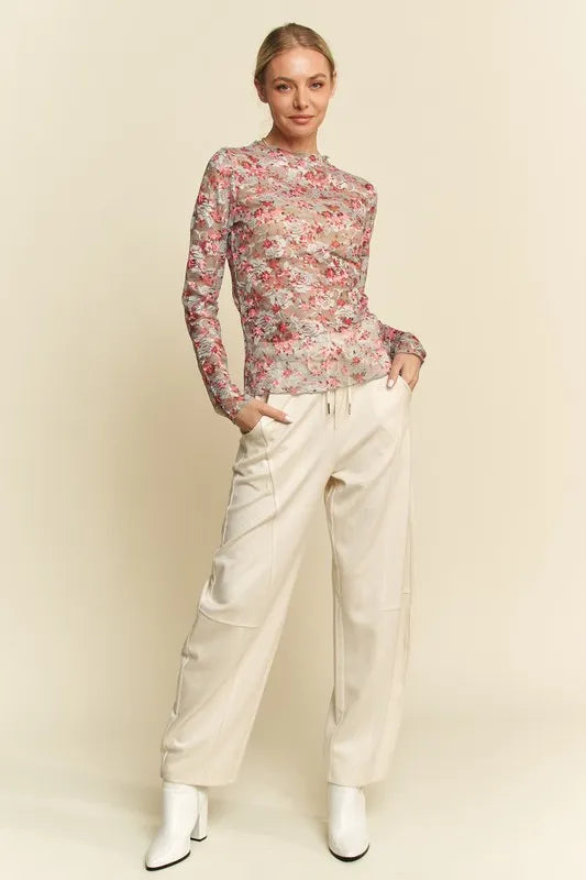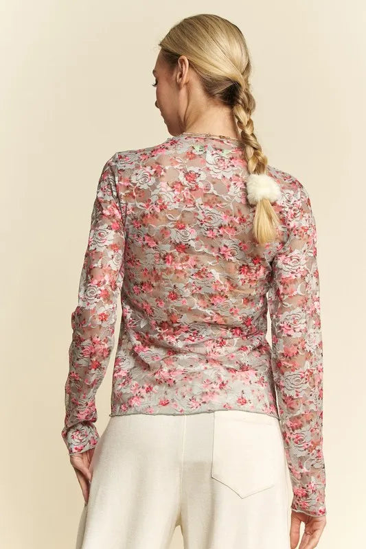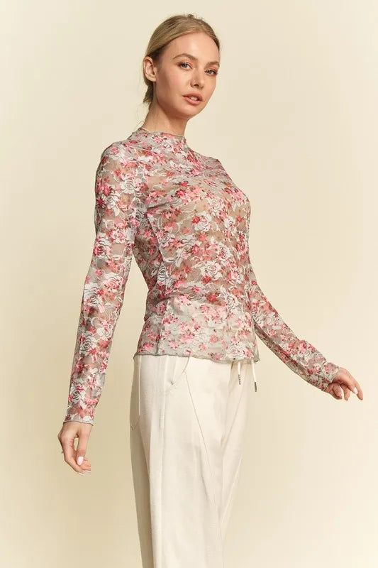 Davi & Dani Floral Print Mesh Long Sleeve Layering Top