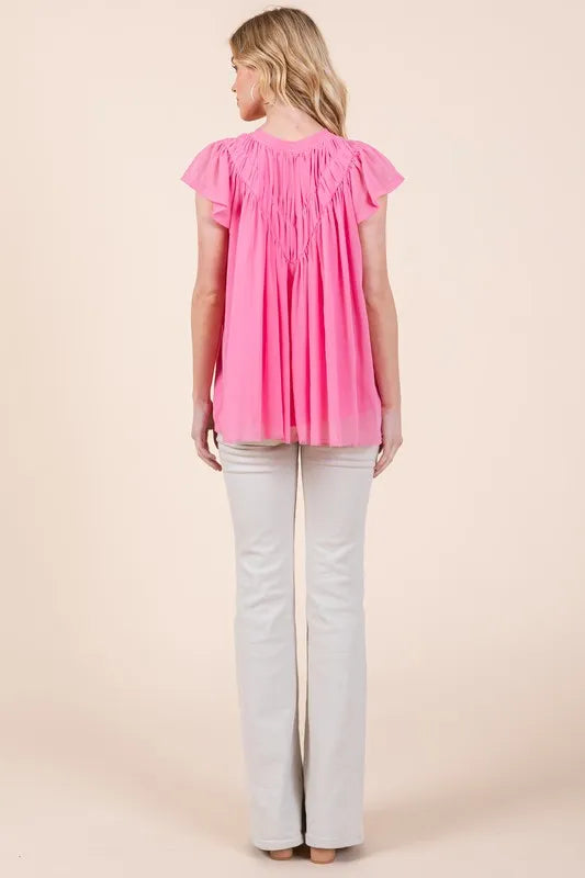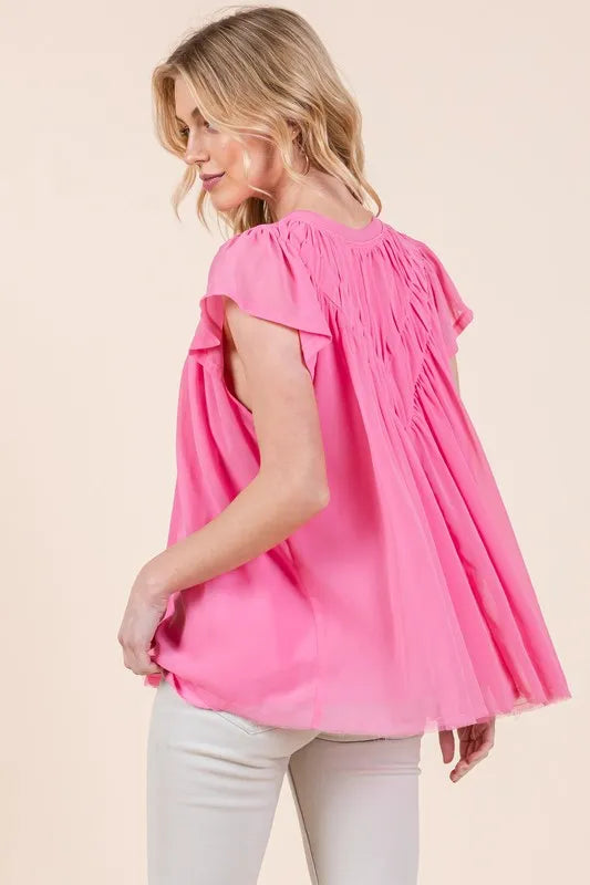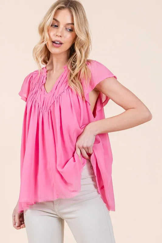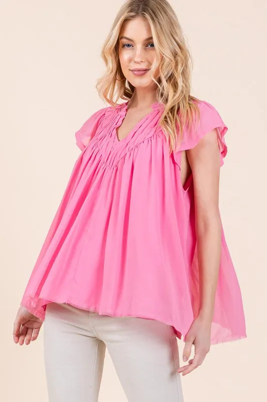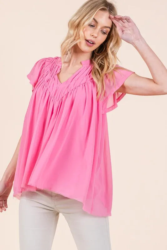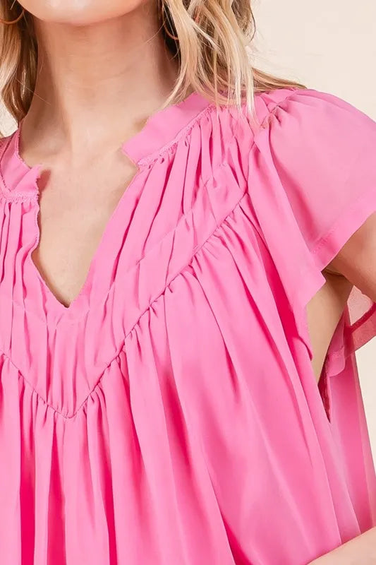 Lime 'N' Chili Solid Shirred Flutter Sleeve Chiffon Blouse - PINK / S is backordered and will ship as soon as it is back in stock.