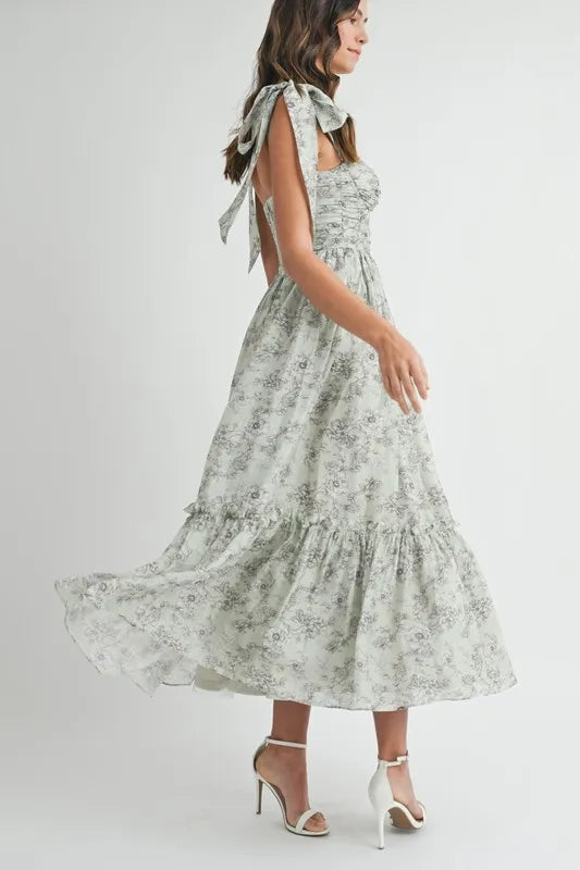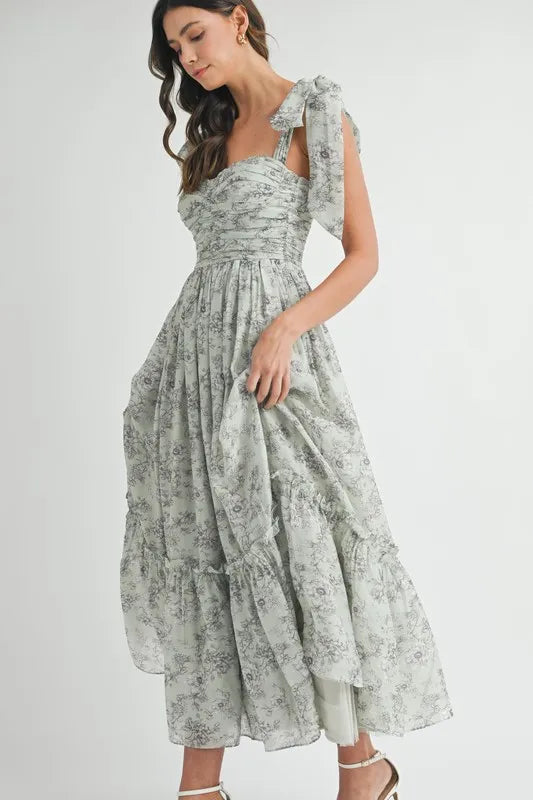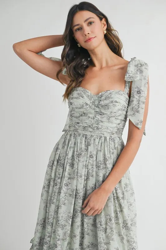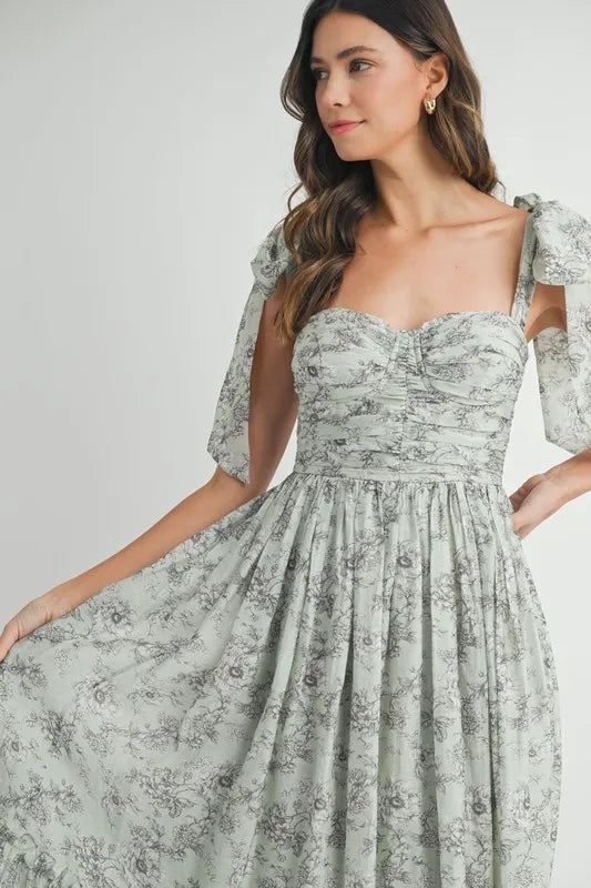 MABLE Floral Bust Ruched Midi Dress with Shoulder Tie - Lt Sage / S is backordered and will ship as soon as it is back in stock.