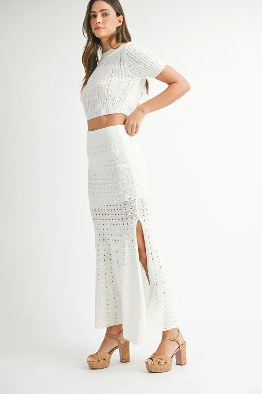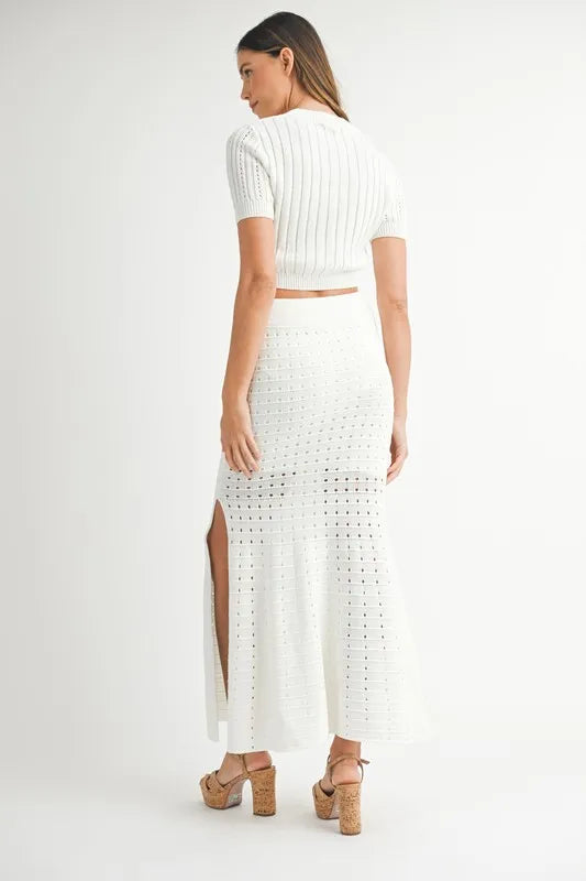 MABLE Pointelle Short Sleeve Crop Top and Slit Skirt Sweater Set