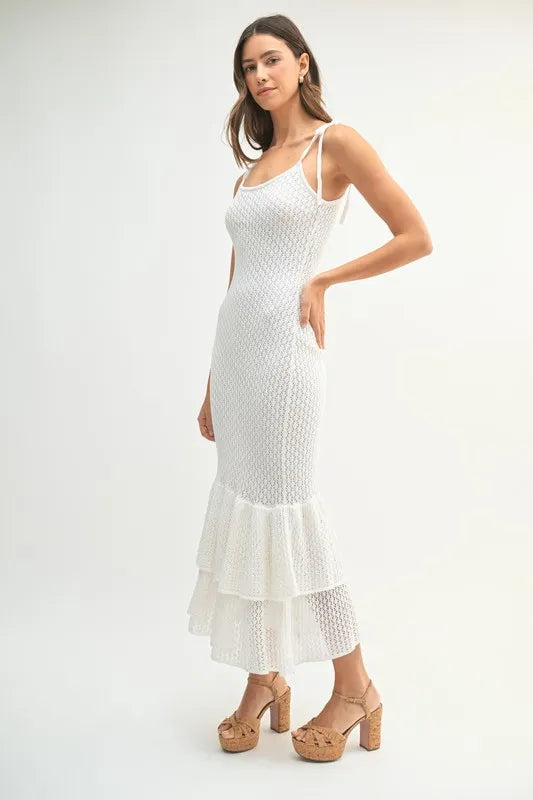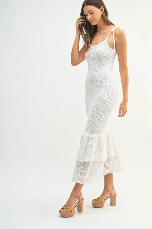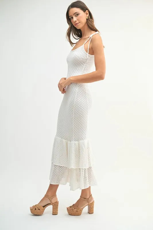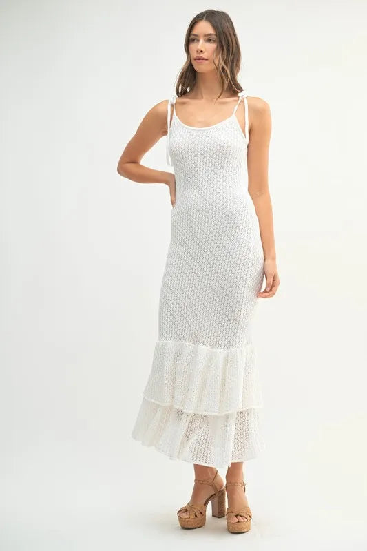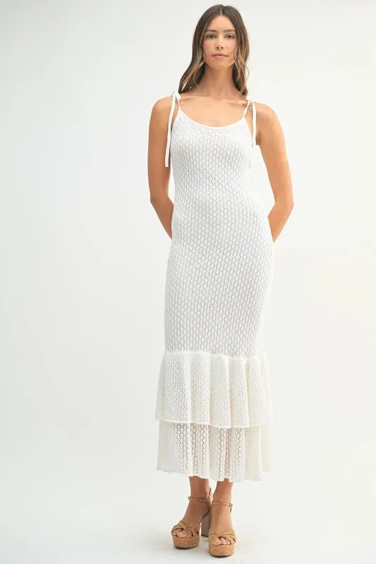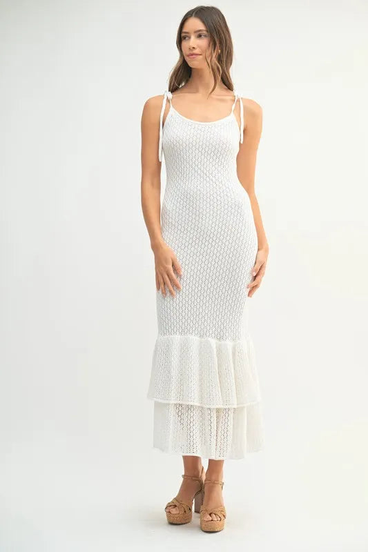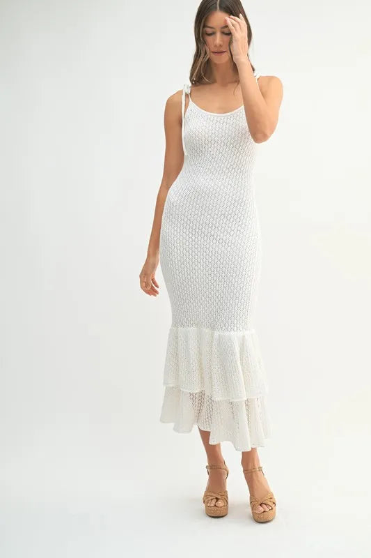 MABLE Sleeveless Shoulder Tie Rose Knit Midi Dress - OFF WHITE / S is backordered and will ship as soon as it is back in stock.