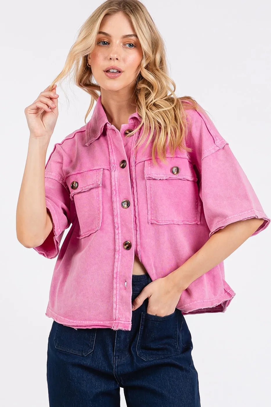 Mittoshop Mineral Wash Boxy Short Sleeve Button Down Shirt - BUBBLEGUM / S is backordered and will ship as soon as it is back in stock.