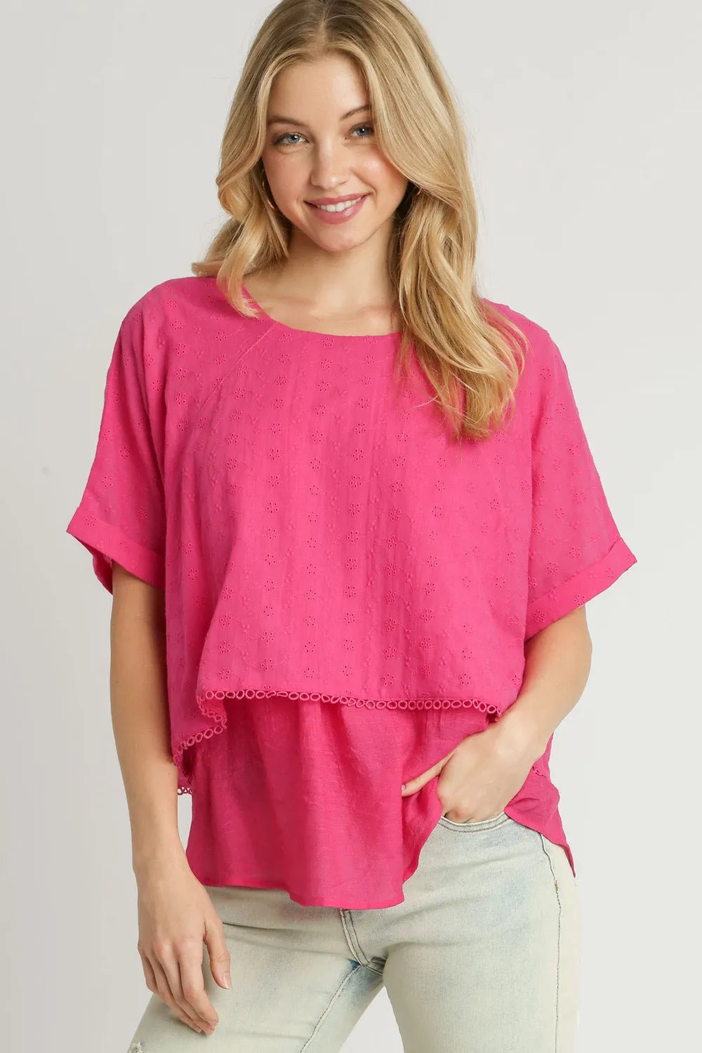Umgee Full Size Eyelet Layered Short Sleeve Blouse Plus Size - Hot Pink / XL is backordered and will ship as soon as it is back in stock.