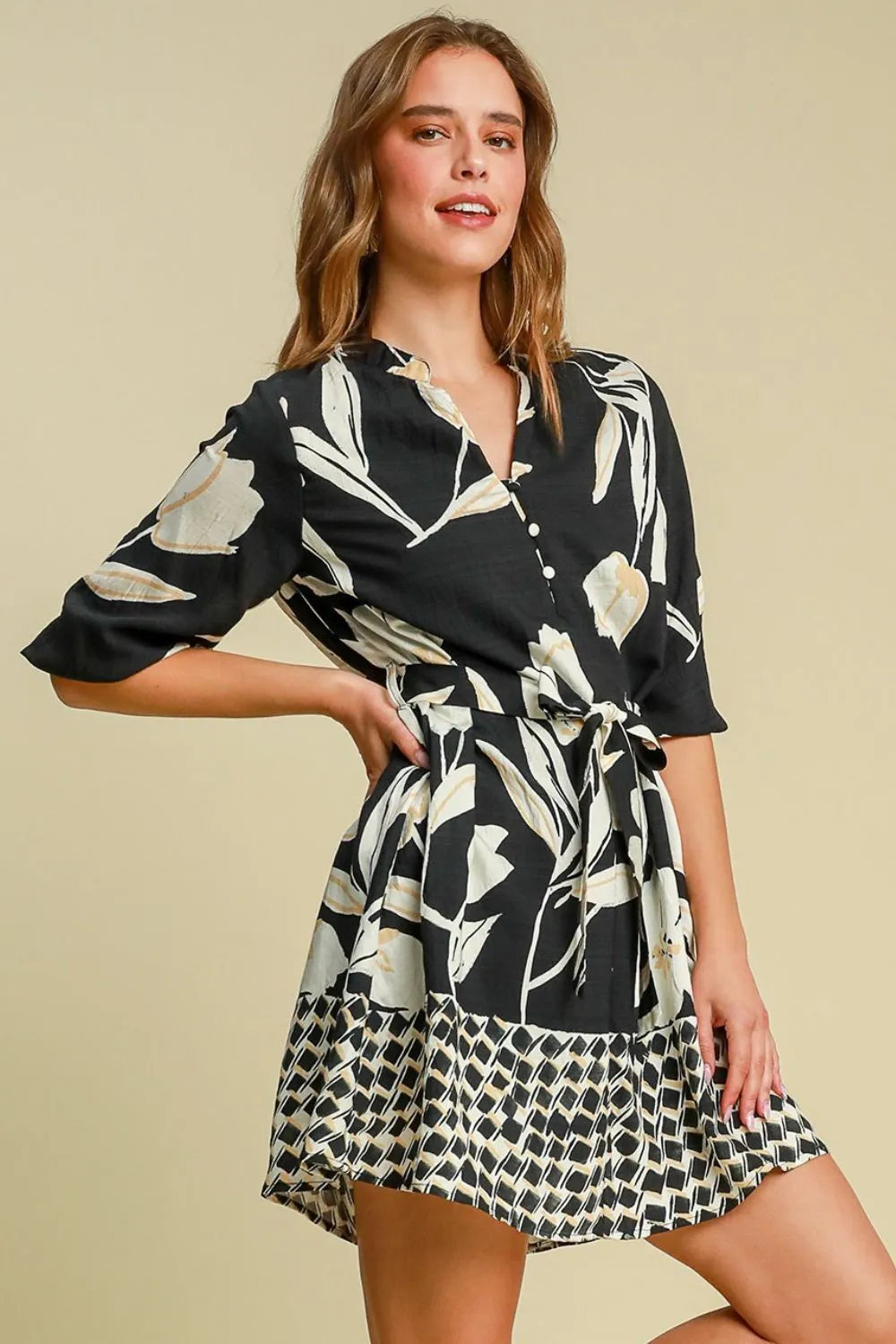 Umgee Full Size Floral Print Notched Tie Waist Mini Dress Plus Size - Black / S is backordered and will ship as soon as it is back in stock.