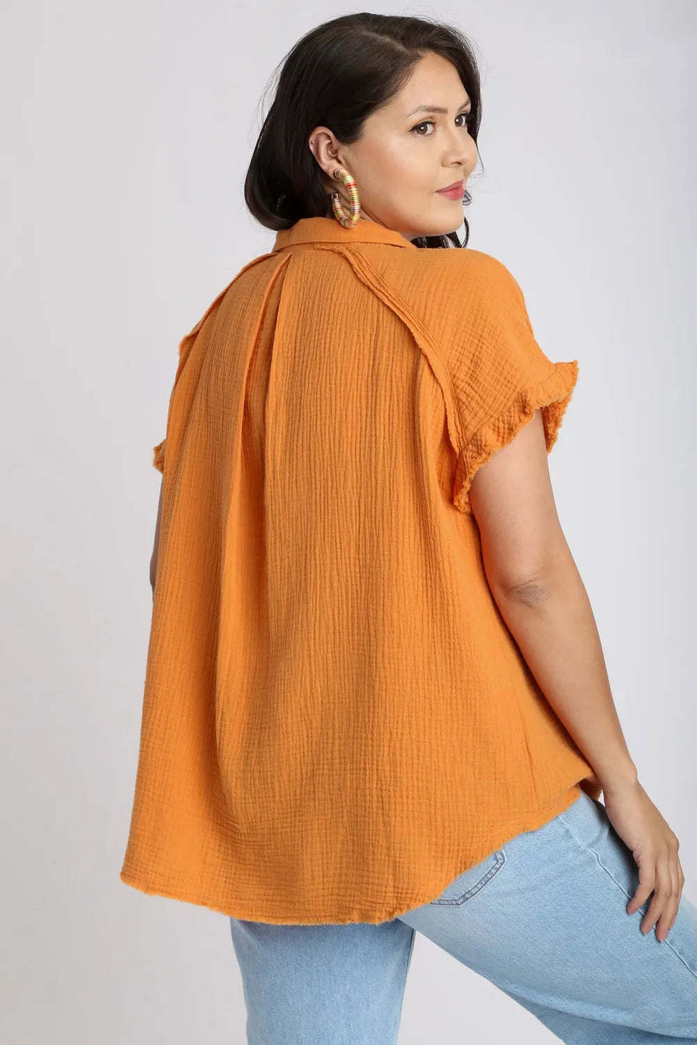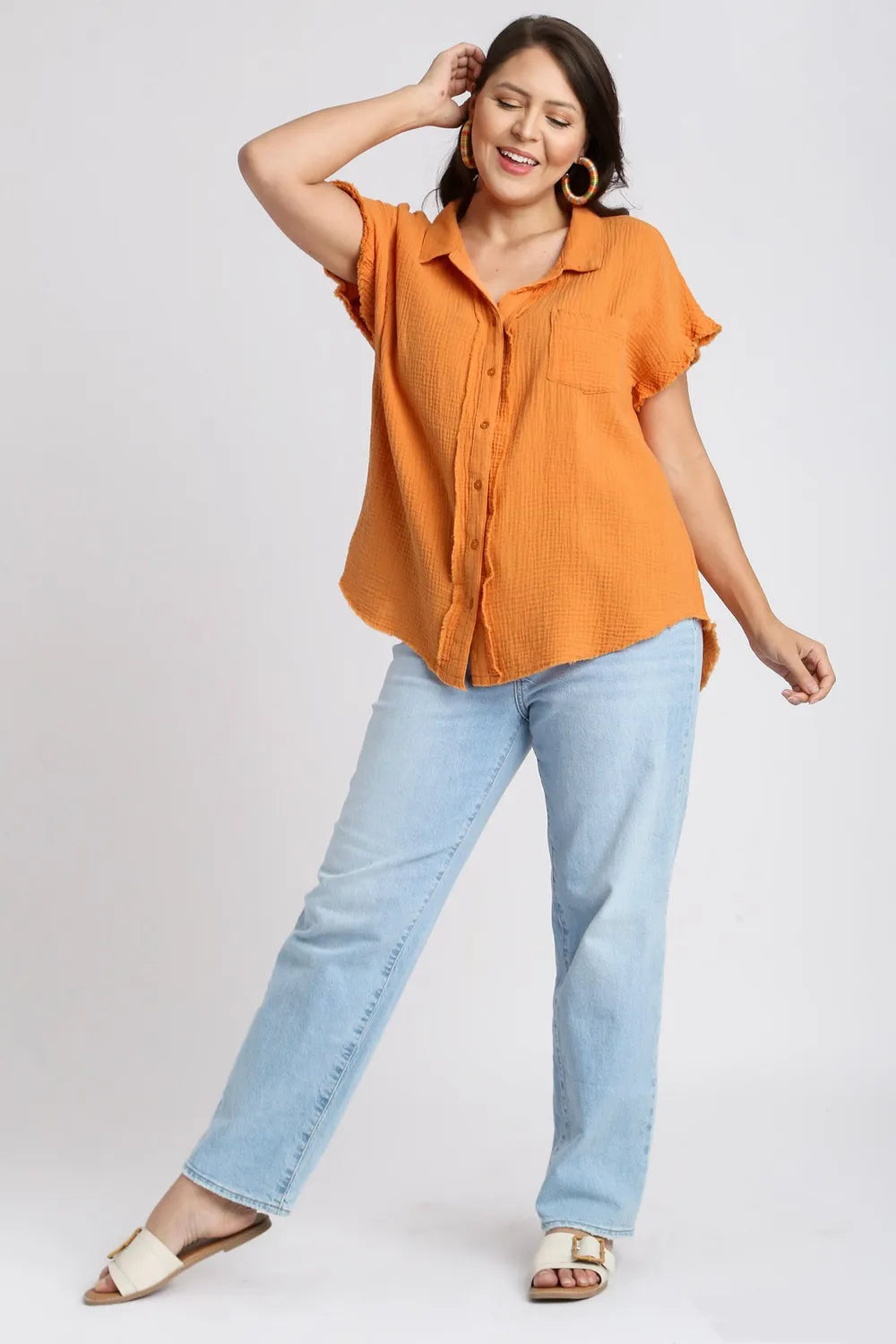 Umgee Full Size Frayed Hem Collared Neck Short Sleeve Shirt Plus Size - Tangerine / 1XL is backordered and will ship as soon as it is back in stock.