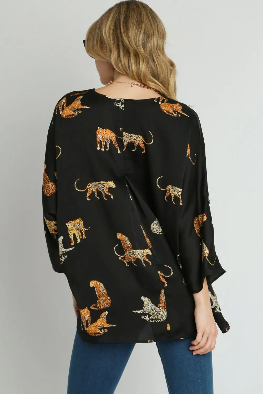 Umgee Full Size High-Low Satin Animal Print V-Neck Blouse Plus Size - Black / M is backordered and will ship as soon as it is back in stock.