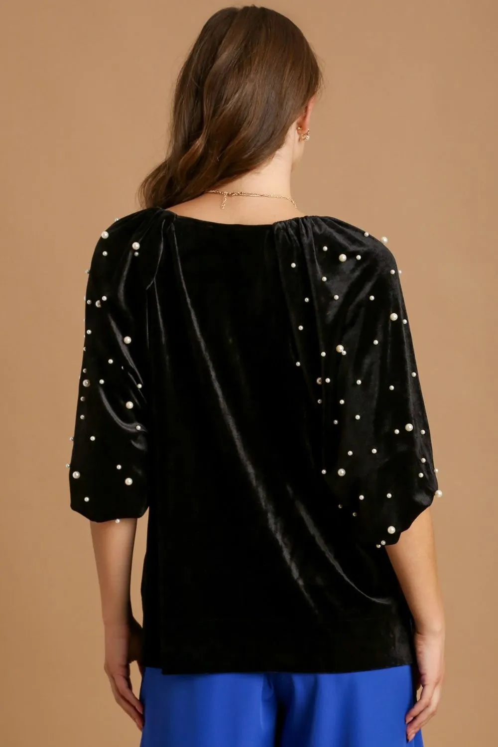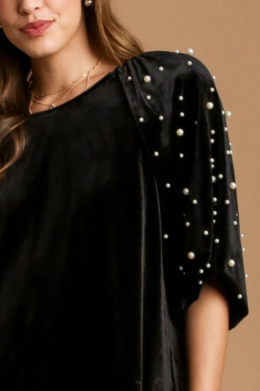 Umgee Full Size Pearl Detail Velvet Round Neck Top Plus Size - Black / 2XL is backordered and will ship as soon as it is back in stock.